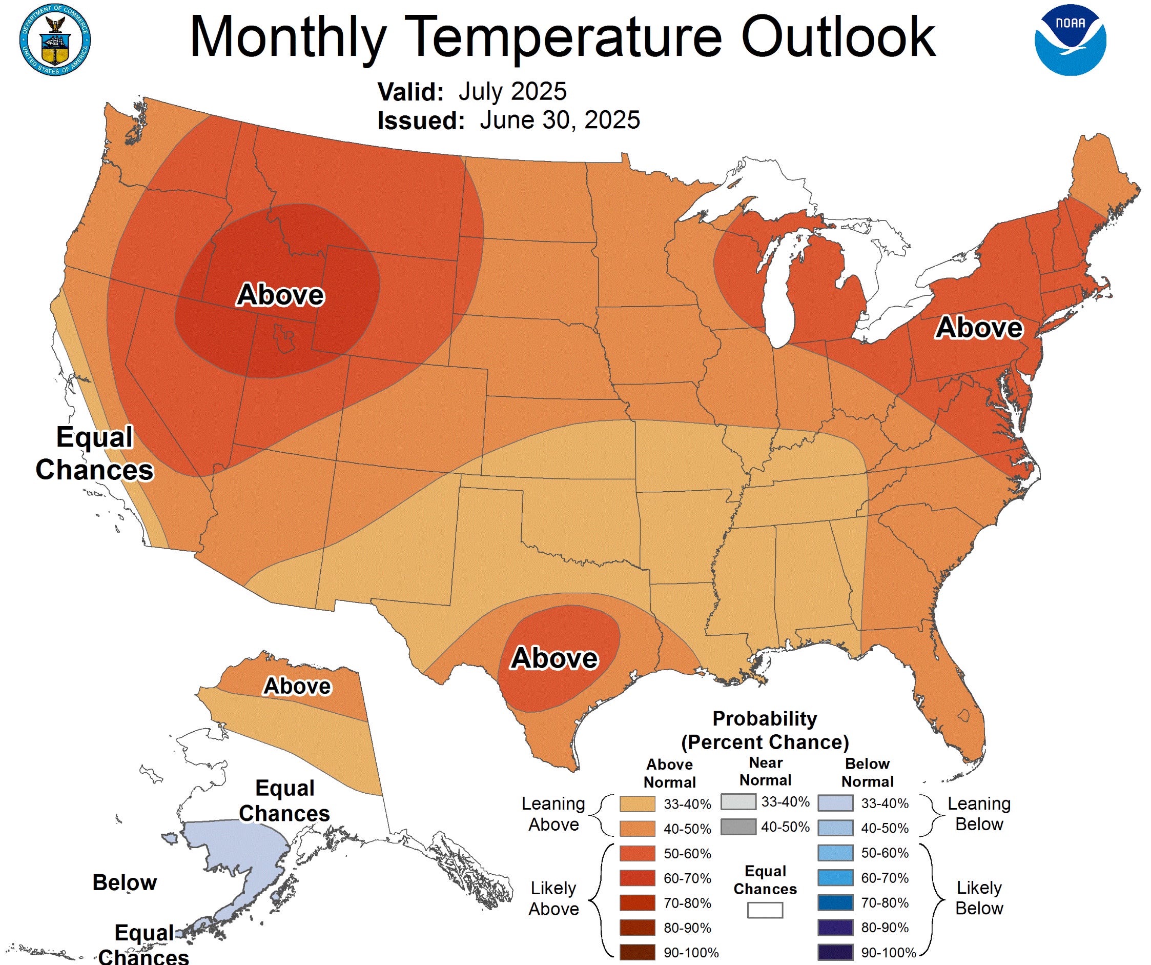 In fact, according to NOAA’s latest forecast, the odds favor a hot July — with a 50–60% likelihood of above-average temperatures and only about a 7% chance of cooler-than-normal conditions.