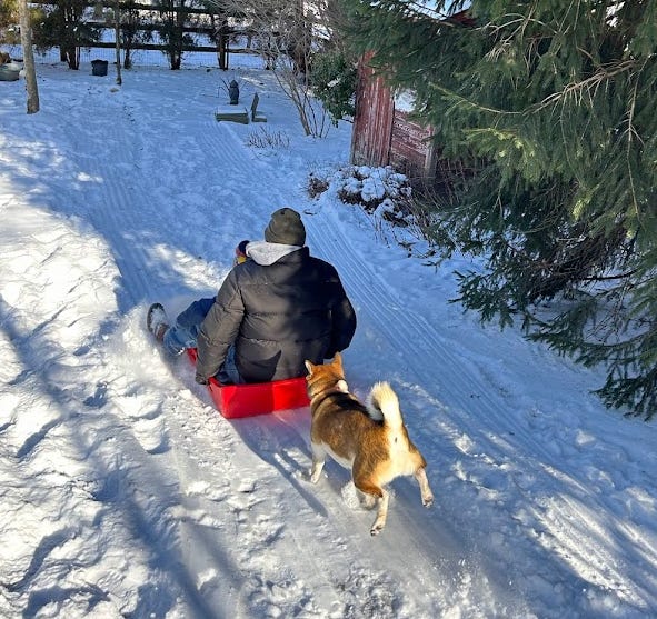 This week’s pattern reminded me of a moment from last winter: my grandson and I sliding down the hill in my backyard, Benji chasing us full throttle — proof that a small push can set the whole ride in motion.