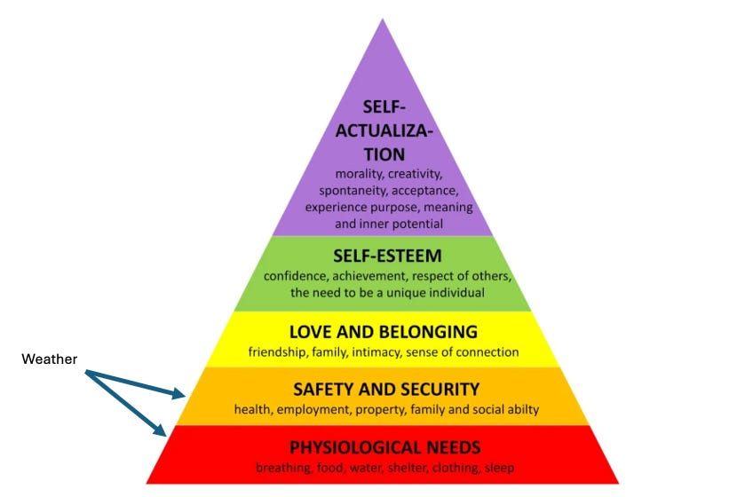 Maslow’s hierarchy of human needs starts at the base for a reason. Physiological needs — breathing, shelter, warmth, sleep. Safety and security — health, protection from the environment. Weather touches both.