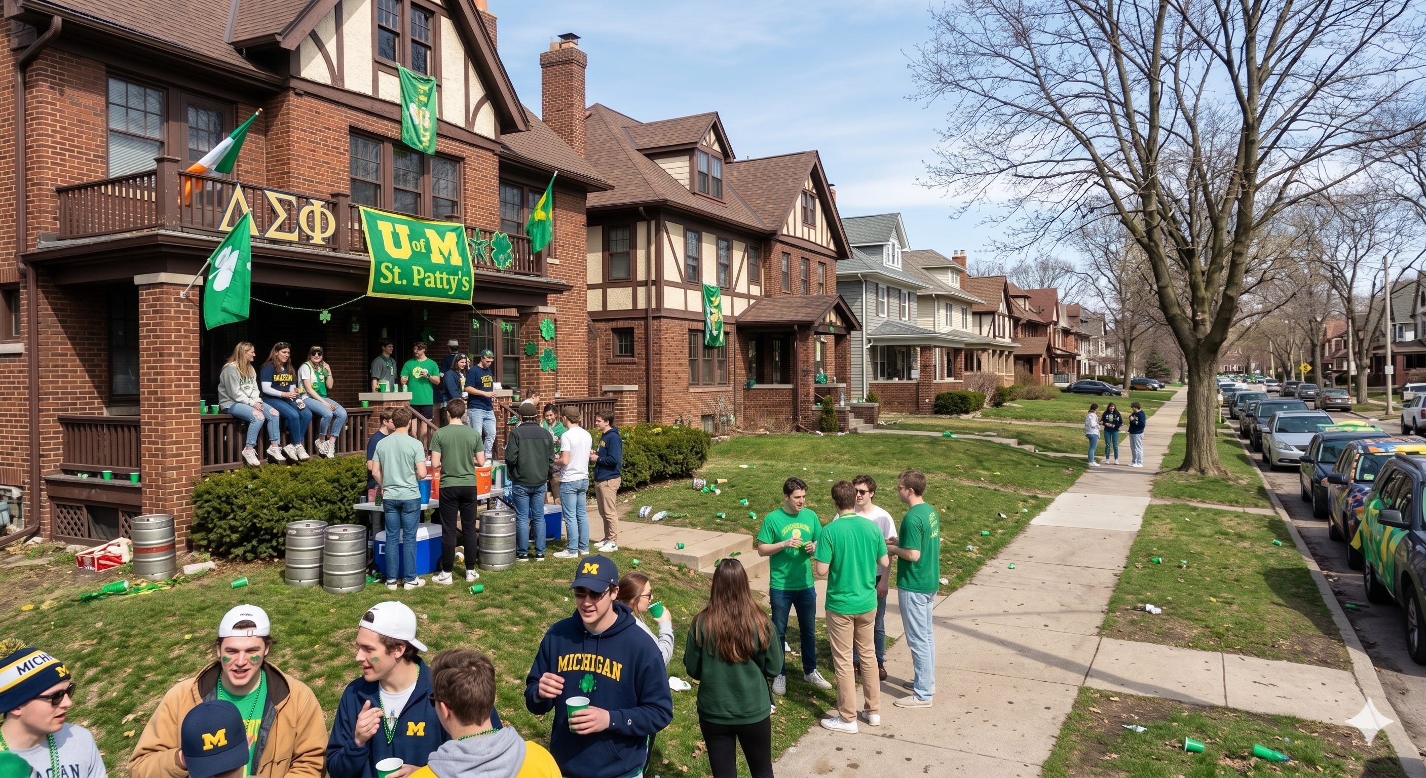 Next, we drove to Ann Arbor to visit Michigan. It was St. Paddy’s Day. One of those early spring afternoons that arrives like a surprise — warm, sunny, and about fifteen degrees warmer than it had any right to be. We walked the campus in shirtsleeves. Students were out everywhere. Frat guys on balconies. There was day drinking happening. The whole campus had the electricity of a great university on a great day.