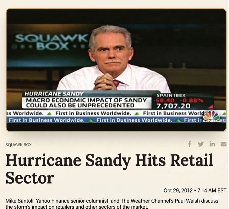 October 29, 2012. Superstorm Sandy is making landfall on the Jersey Shore. On a beeline (it seemed), for the CNBC headquarters in Englewood Cliffs. I was live on Squawk Box with Mike Santoli, reporting on the storm’s impact on retailers and the broader consumer economy as it was happening.