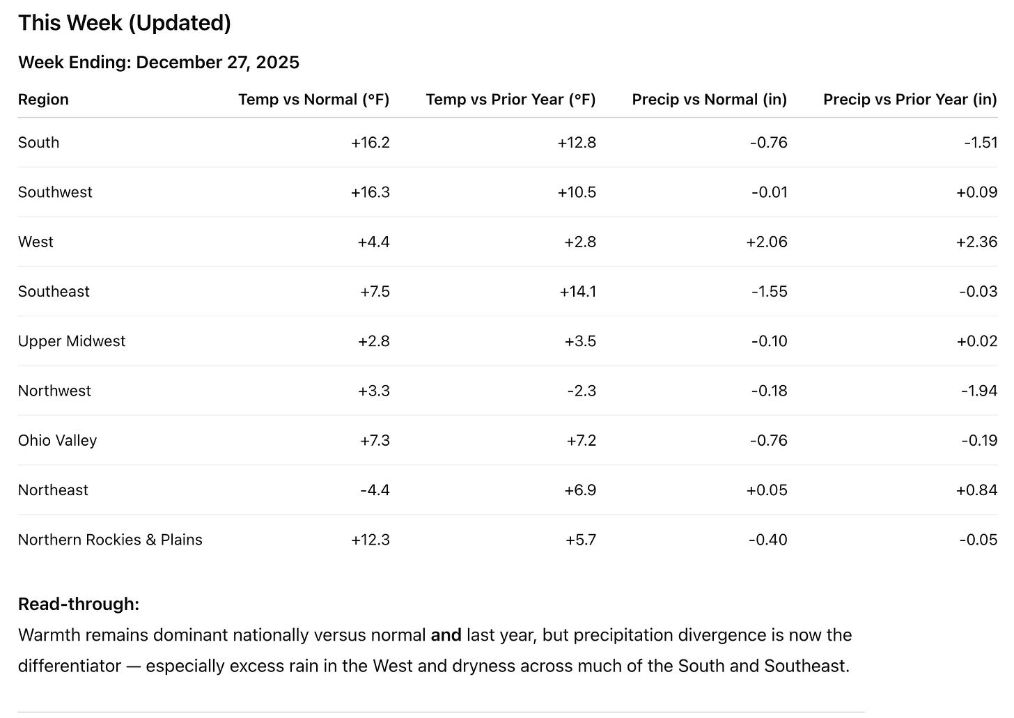 This is no longer a story about national weather tailwinds. It’s a regional execution test — where rain, colder turns, and late-season timing determine whether inventory clears cleanly or leaks into January margin pressure.