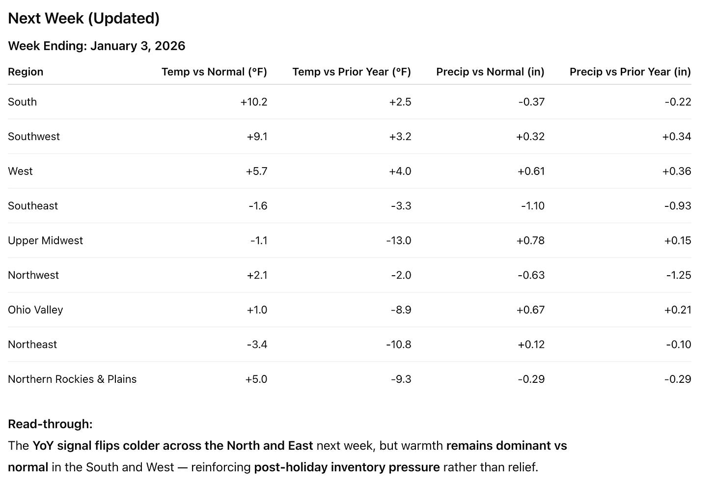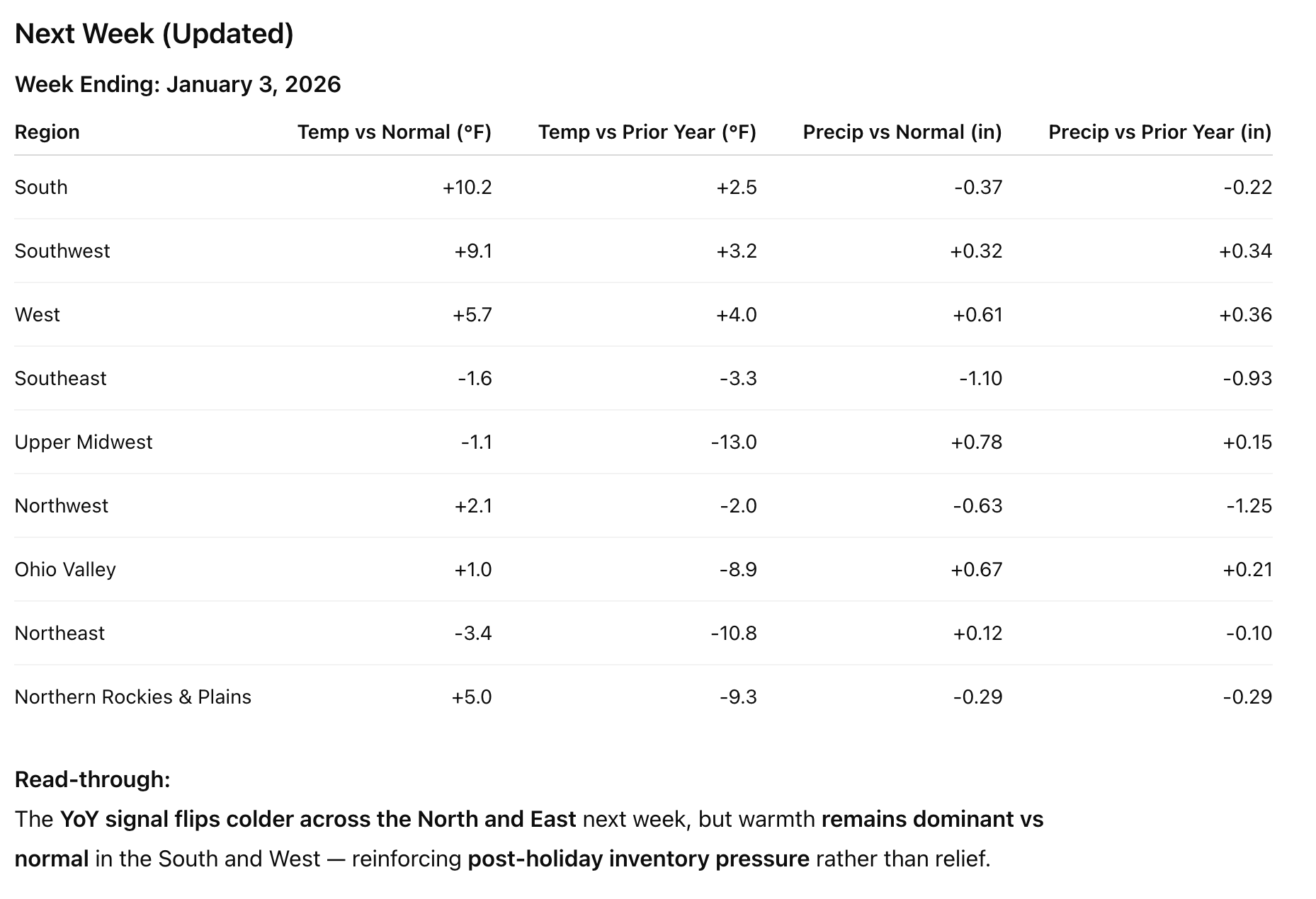 Next week flipped meaningfully colder across most regions, removing any warm-weather relief for January inventory