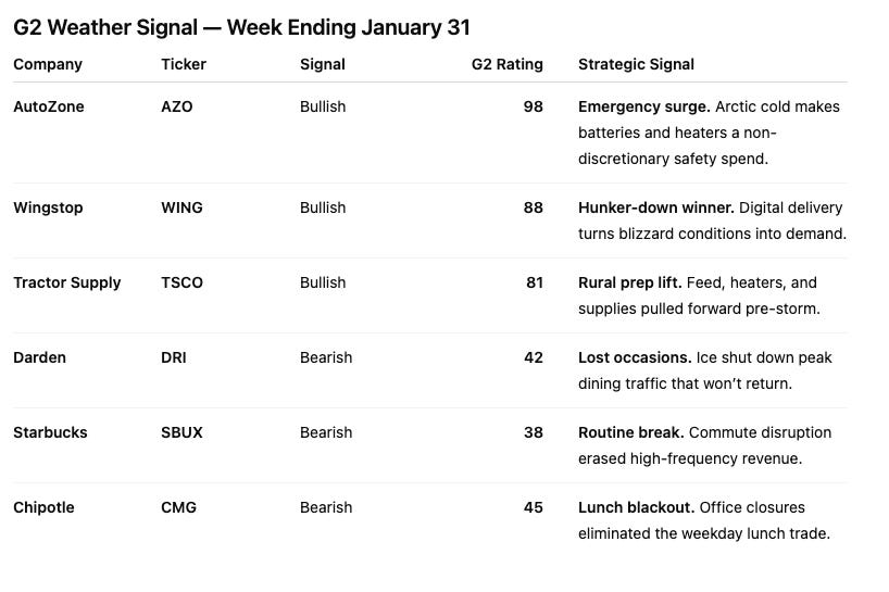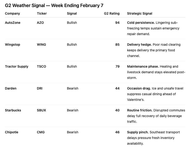 That favors maintenance demand, not panic buying. Emergency repair categories stay active as sub-freezing temperatures sustain failure-based spend. AutoZone benefits from cold persistence, Tractor Supply shifts into ongoing heating and livestock maintenance, and delivery-first platforms like Wingstop remain advantaged where road clearing is slow.
