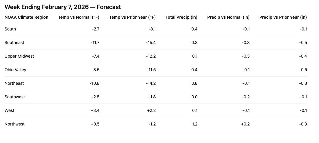 Last week delivered a clean winter shock, with much of the eastern U.S. recording double-digit cold relative to normal and the prior year. Snow and ice were concentrated in high-density areas, causing widespread mobility disruptions.