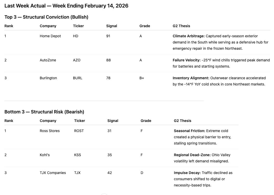 Cold across the Northeast and Upper Midwest extended winter-driven demand, supporting categories tied to repair, auto, and essentials—benefiting names like Home Depot (HD), AutoZone (AZO), and Kroger (KR).