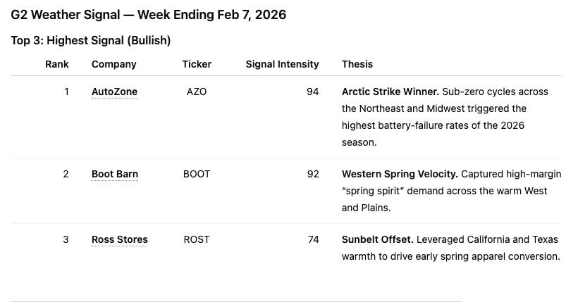 AutoZone (AZO) was the most direct beneficiary of last week’s Arctic setup. Sub-zero cycles across the Northeast and Midwest drove the highest battery and starter failure rates of the season, pulling forward high-margin “failure item” demand. This was not discretionary spend — it was weather-forced replacement.