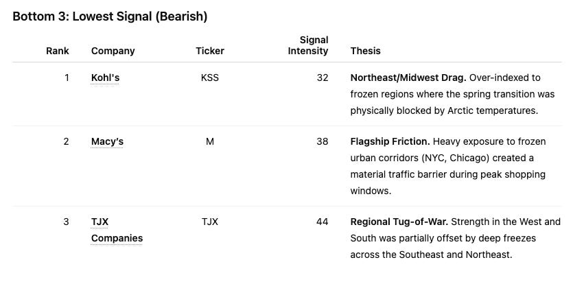 For Kohl’s (KSS), the setup was tougher. Heavy exposure to the Northeast and Midwest effectively stalled the spring transition.