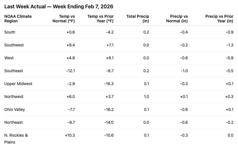 This Week: Flips the script with broad national warmth except for a still-cold Northeast—a reset week for traffic and demand.