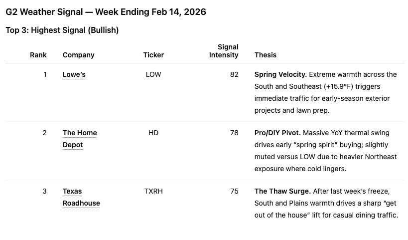 The timing is notable. This is the week leading into Valentine’s Day, when seasonal warmth in the South tends to amplify dining, gifting, and discretionary trips. Warm, dry conditions don’t just support demand — they pull it forward.