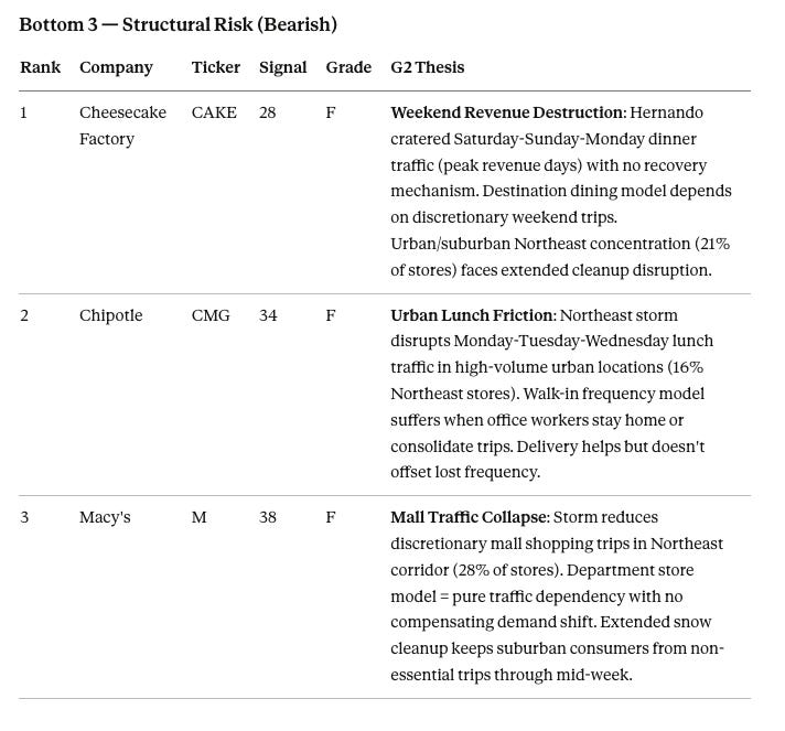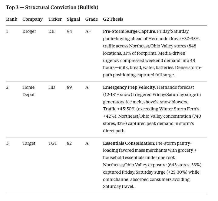 The pre-storm surge materialized as predicted—grocery and home center traffic spiked 30-50% Friday/Saturday ahead of Sunday’s snowfall.