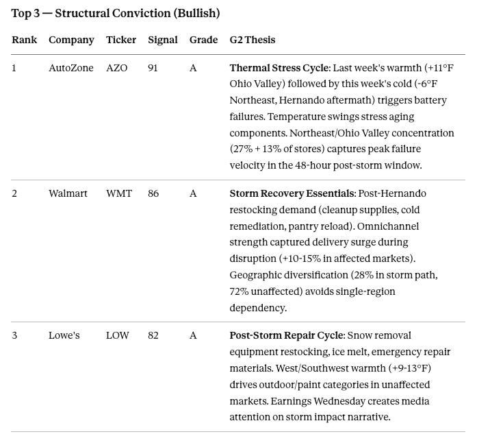 HD/LOW Earnings (This Week): Weather signal neutral (50/100) for Q4 FY25 (Nov-Jan). Monthly volatility (warm November, volatile December, cold January) averaged to near-normal conditions. Weather won’t drive the earnings narrative—Pro channel, big-ticket, and margins will.