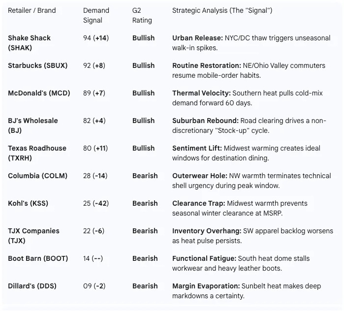 Retail implication: localized winter helps the names with dense cold-market exposure and clean winter positioning — but it doesn’t bail out winter assortments nationally.