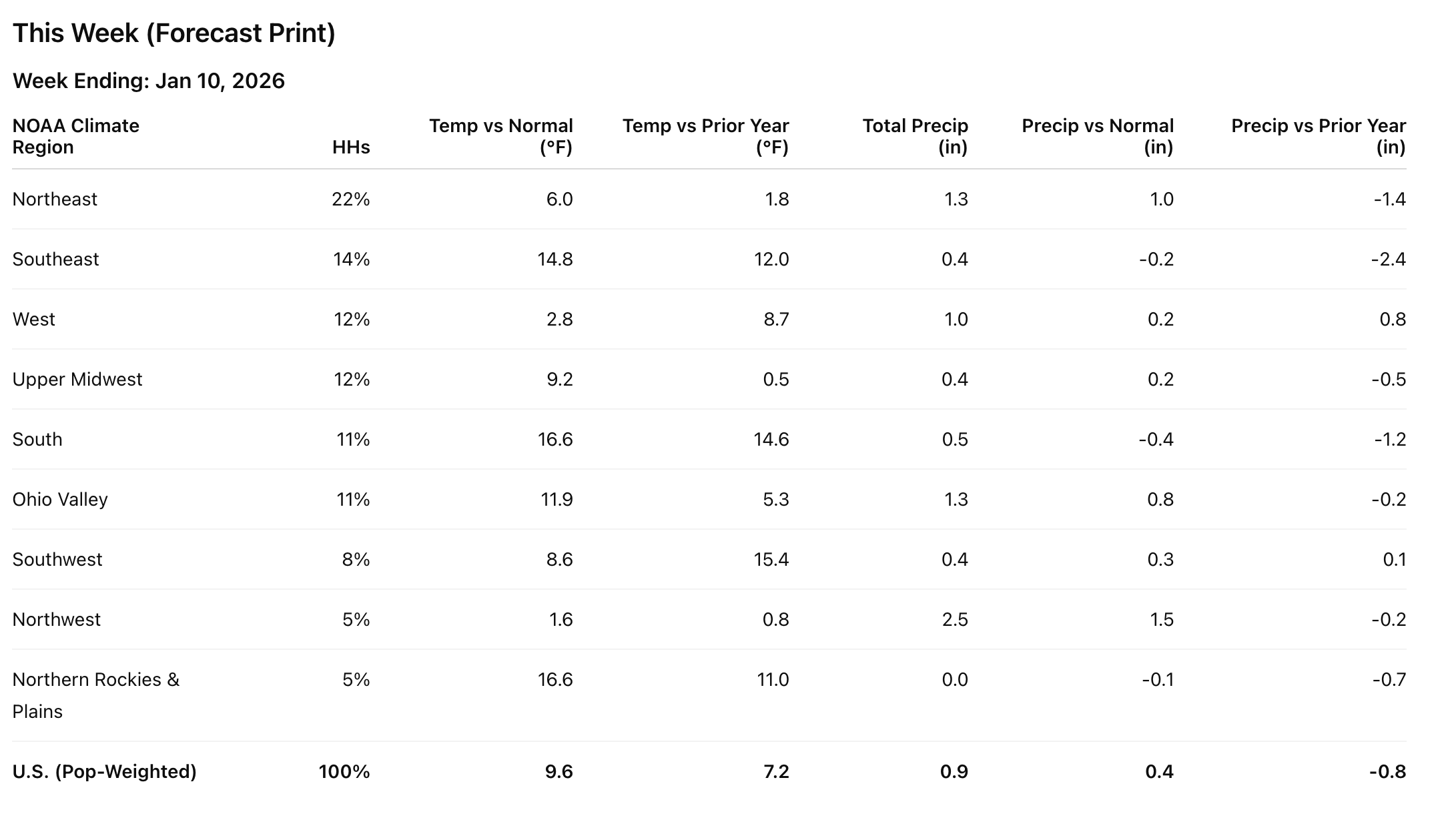 The biggest tell is the Northern Rockies & Plains YoY shock. A swing that large usually means last year featured deep, persistent cold in that region during the comparable week — and this year is the opposite: a springlike regime. That changes everything from driving conditions to trip frequency to what’s even visible in the store.