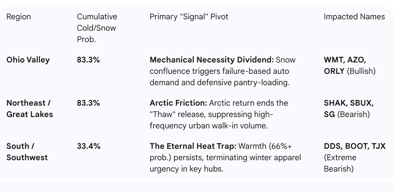 That setup reintroduces winter friction for northern markets — benefiting cold-exposed categories like outerwear, home heating, snow removal, and winter energy demand — while pressuring early-season spring categories. In contrast, the South and Southwest remain structurally warm, favoring lighter apparel, outdoor activity, and continued drag on winter-dependent demand across the Sunbelt.
