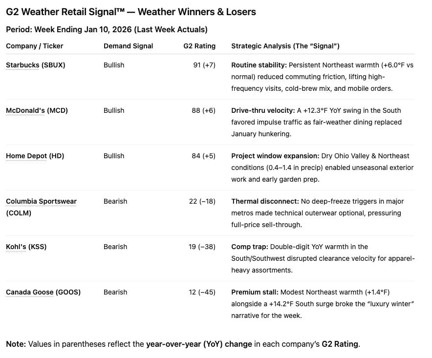 Weather resets demand. A record warm early January flipped consumer behavior, lifting traffic-driven categories while pressuring winter clearance.