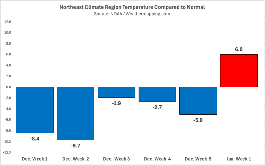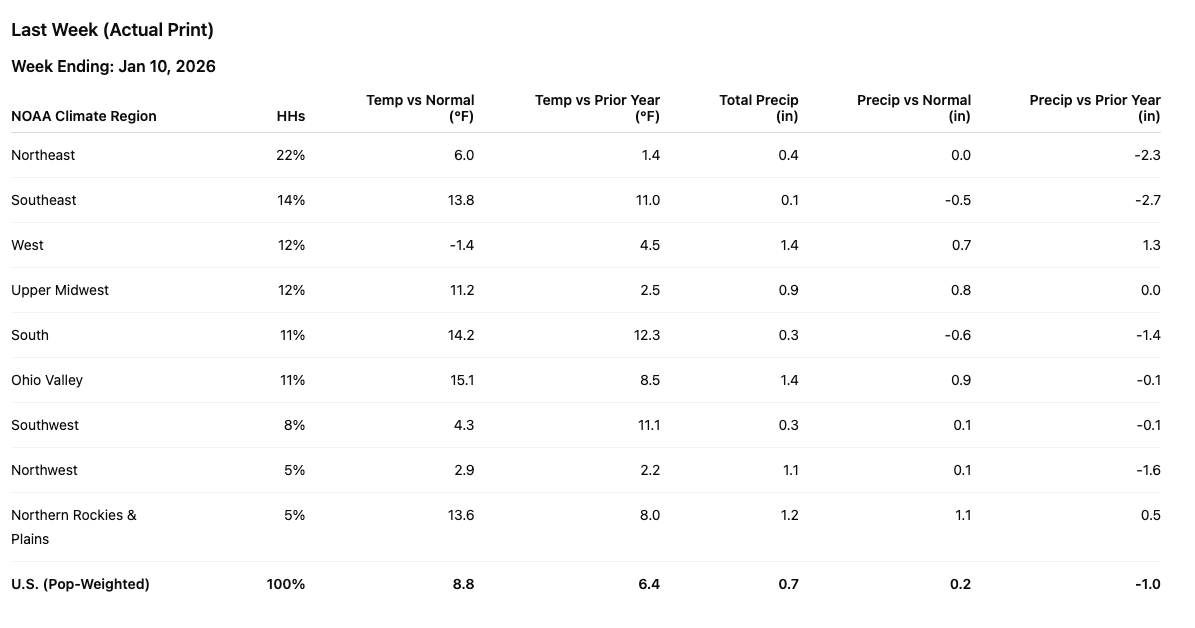 The U.S. posted a +8.8°F national temperature anomaly — the warmest early-January week in six years and nearly 14°F warmer than a year ago. When weather moves that fast, behavior flips.