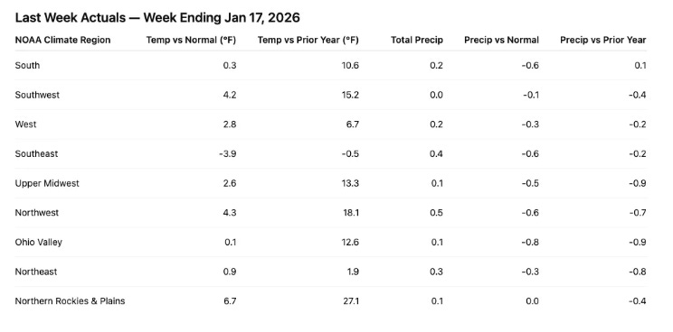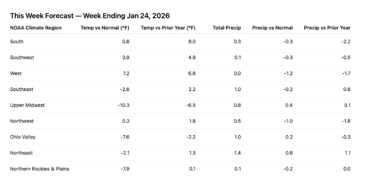 Precipitation remained generally light and below normal across most regions, reducing disruption but also offering little incremental demand catalyst.