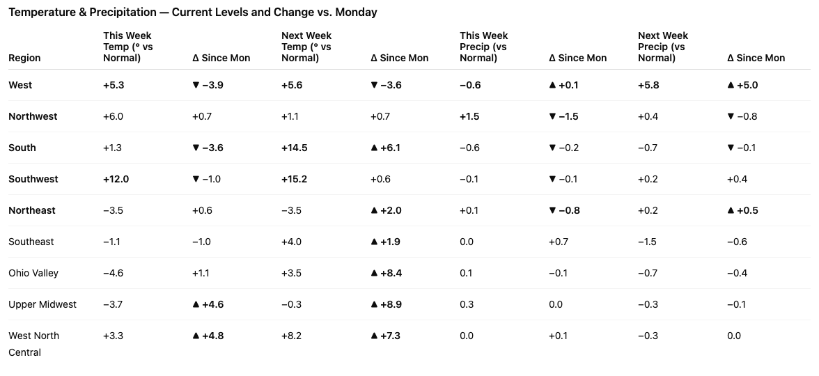 This Friday update refreshes the weather signal from Monday’s Flash using what actually happened this week and the latest forecast for next week.