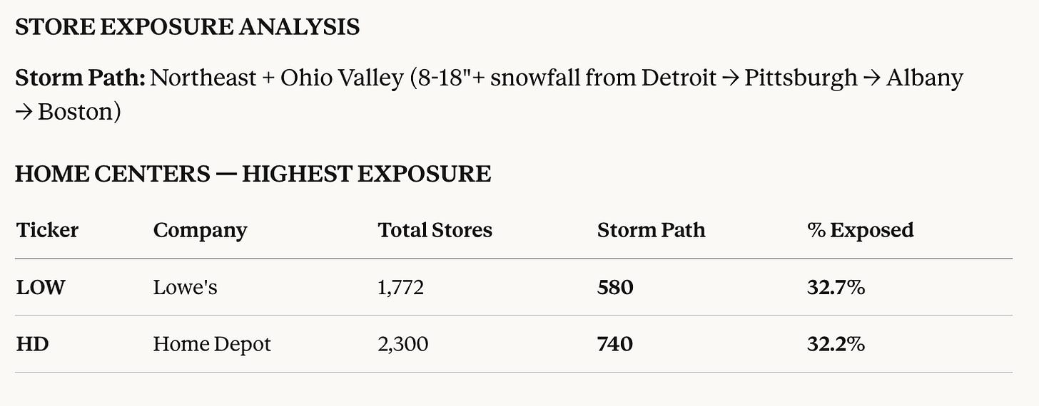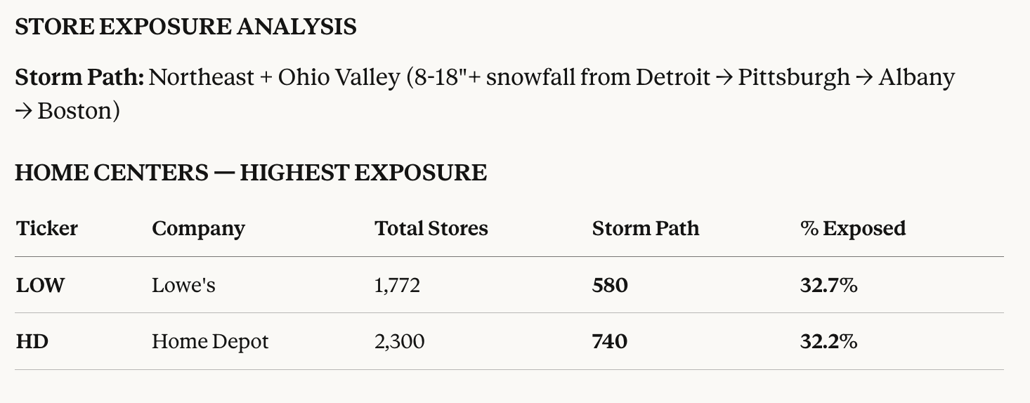 Impact: Emergency prep (shovels, ice melt, generators, space heaters) + DIY weekend project disruption. Net: Slight positive (pre-storm surge offsets weekend traffic loss).