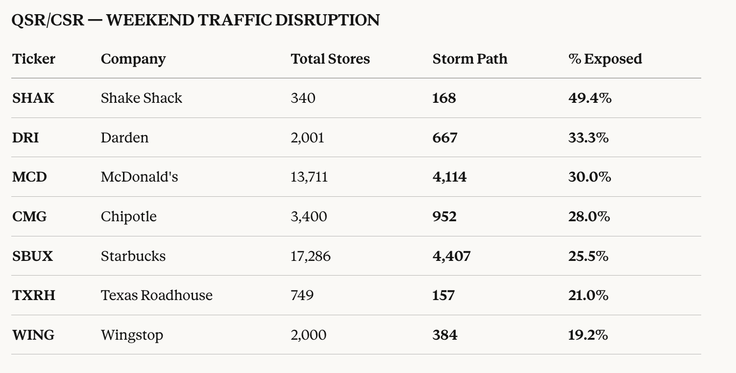 Standout: BJ’s (76% exposure) — extreme concentration in storm path. This weekend’s results will significantly impact their performance. The store count understates the revenue impact: BJ’s over-indexes in dense Northeast metros (Boston, NYC suburbs, Philly) where volume per location far exceeds the chain average. A single BJ’s in suburban Boston likely generates more weekend sales than three stores in lower-density markets. Actual sales exposure is probably closer to 80%+.