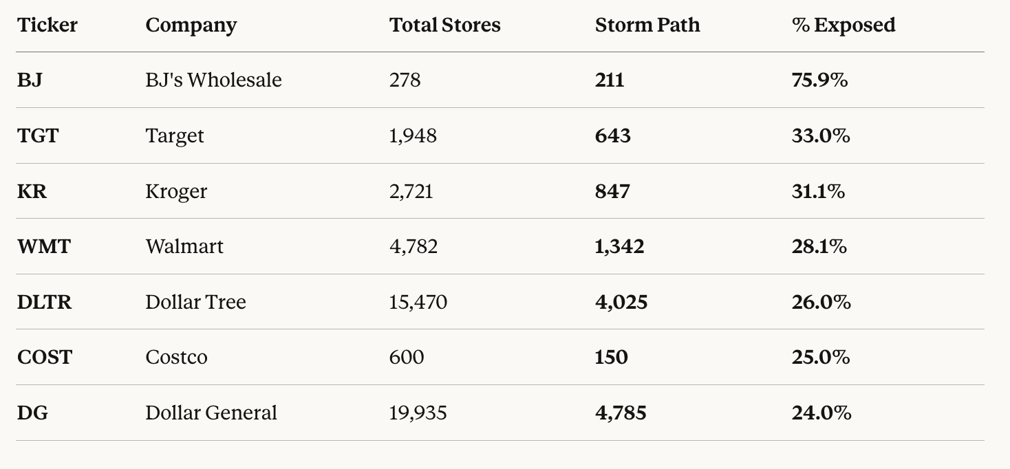 Store location data is based on publicly available information and third-party sources. Exact store counts may vary, but regional exposure percentages reflect approximate market concentration and are directionally accurate for assessing weather-related sales impact.