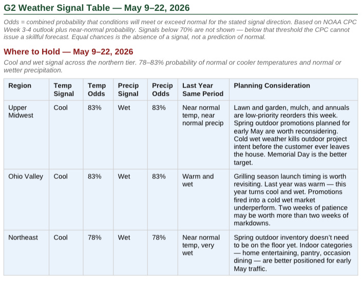 Cold, wet Saturdays in early May don’t just suppress sales — they delay intent. The consumer who didn’t make it to the nursery the first two weekends of May is the same consumer who shows up in force if Memorial Day delivers.