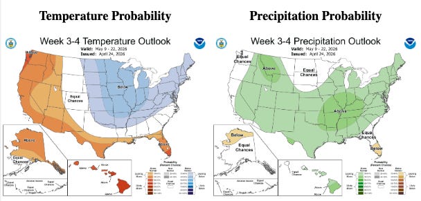 NOAA’s latest 3-4 week outlook covers the period from May 9–22. The Midwest, Great Lakes, and Northeast are tracking cold and wet — with well-below-normal temperatures and above-normal rainfall across the region. Chicago. Cleveland. Detroit. Minneapolis. Boston. New York.