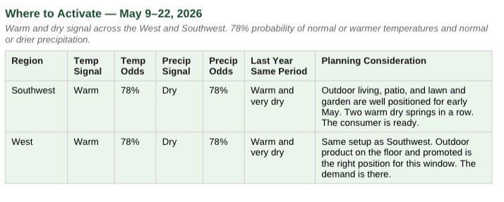 In Phoenix, Las Vegas, and Southern California, the warm signal has been consistent for weeks. Outdoor living demand is building. The consumer is ready now.