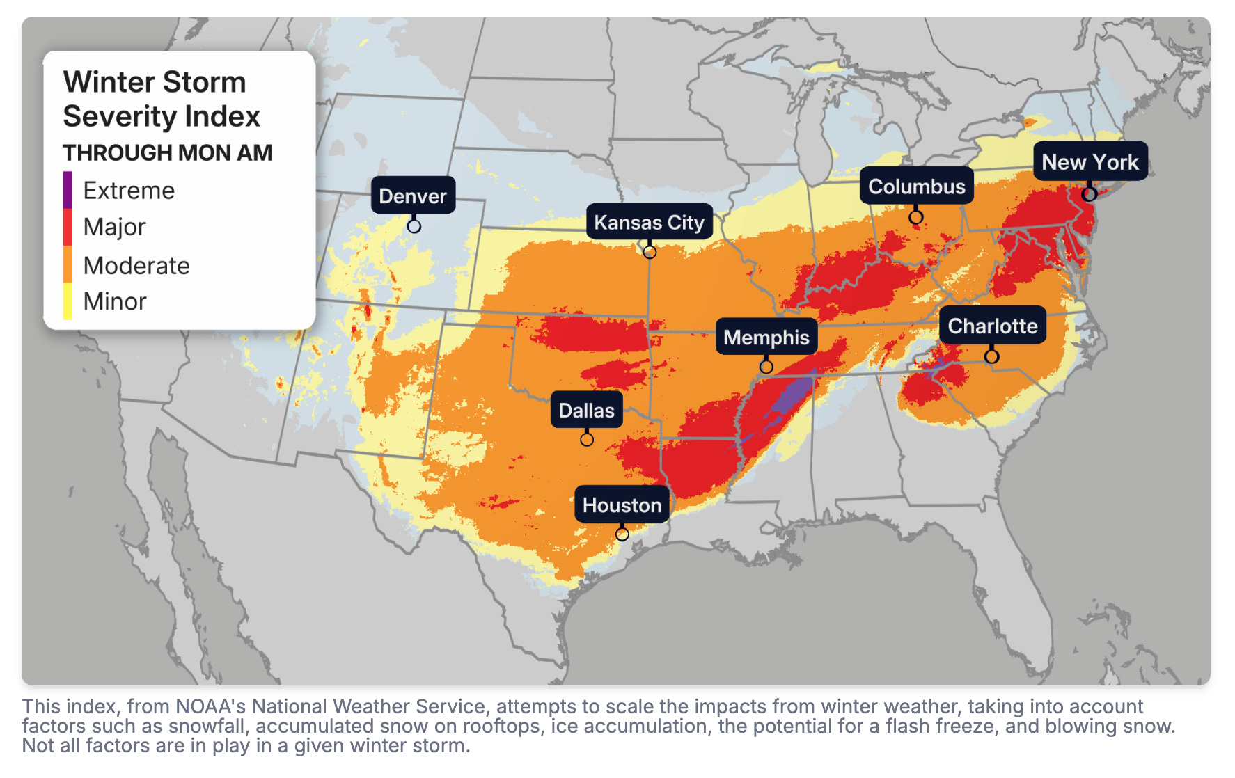 The combination matters. Ice drives power outages; extreme cold prolongs them. Together, they create a multi-day drag on consumer activity across some of the most densely populated regions of the country.