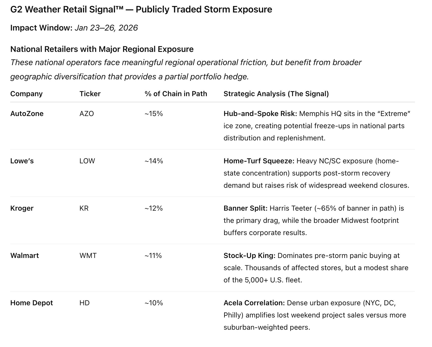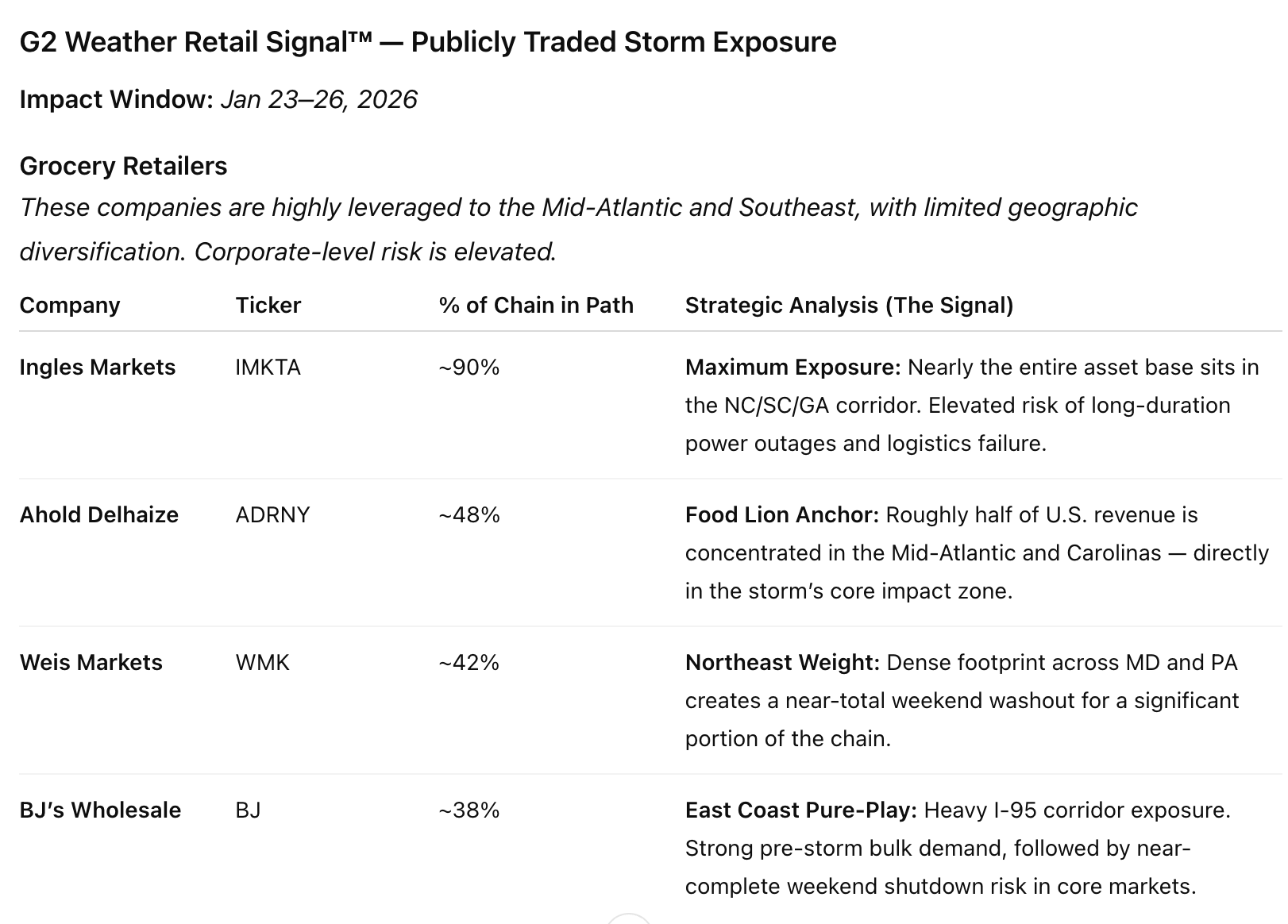 This storm doesn’t need to over-deliver to matter. Even moderate ice accumulation can create meaningful margin pressure, inventory losses, and adverse Q4 commentary.