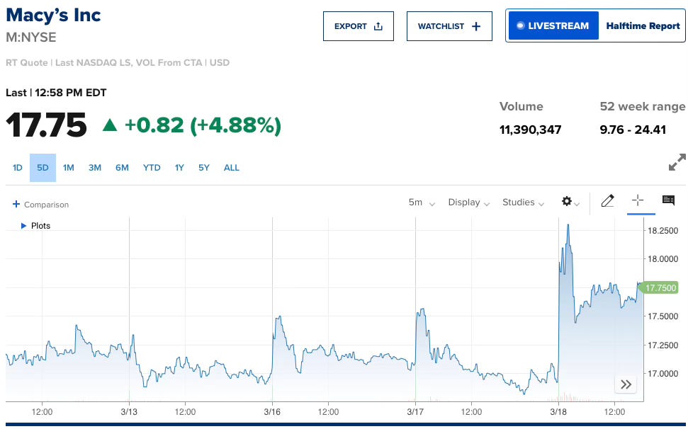 CEO Tony Spring described four consecutive quarters of better-than-expected performance and broad-based improvement across the business. Macy’s shares jumped more than 7% at the open.