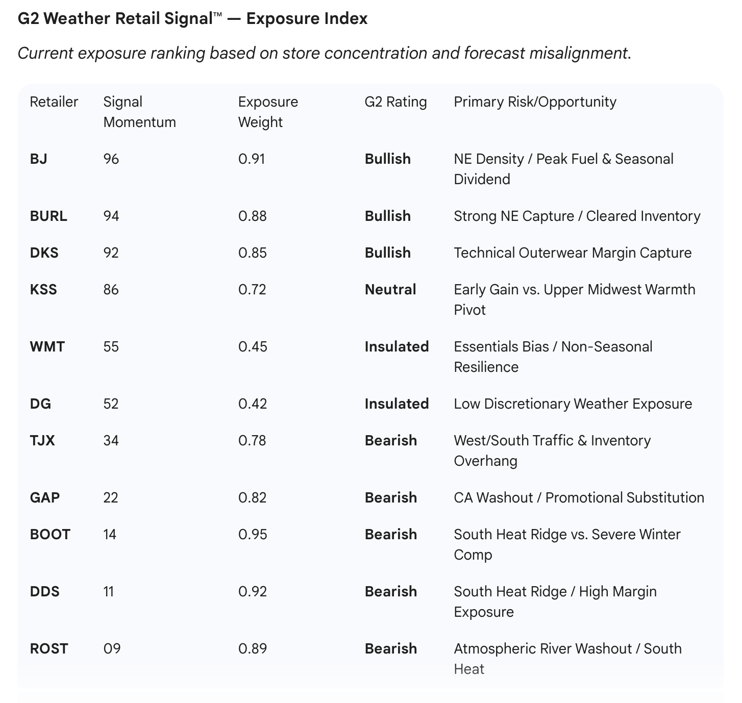 The following ratings represent the delta between business as usual and weather-driven reality. By identifying where a retailer’s inventory is structurally misaligned with the current environment, the Index serves as a leading indicator for markdown risk and margin compression well before they appear in quarterly filings.