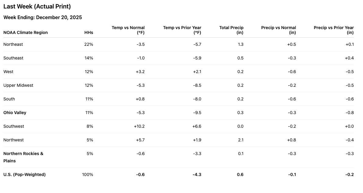 KSS (The Pivot): The expansion of unseasonable warmth into the Ohio Valley (+13.0°F) and Upper Midwest (+11.2°F) creates a sharp pivot from the support they enjoyed earlier in the month, raising immediate markdown risk for post-holiday clearance.