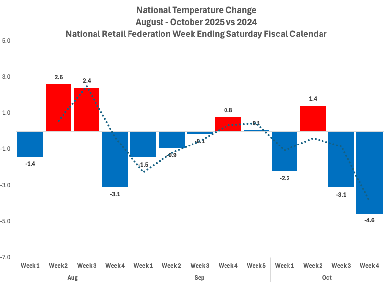 Through September, temperatures fluctuated modestly across regions. Nothing dramatic, but enough to keep people engaged with transitional goods—sweatshirts, lightweight jackets, denim, footwear. The national comparison to last year averaged nearly flat across the month, but the early-August coolness had already created momentum.