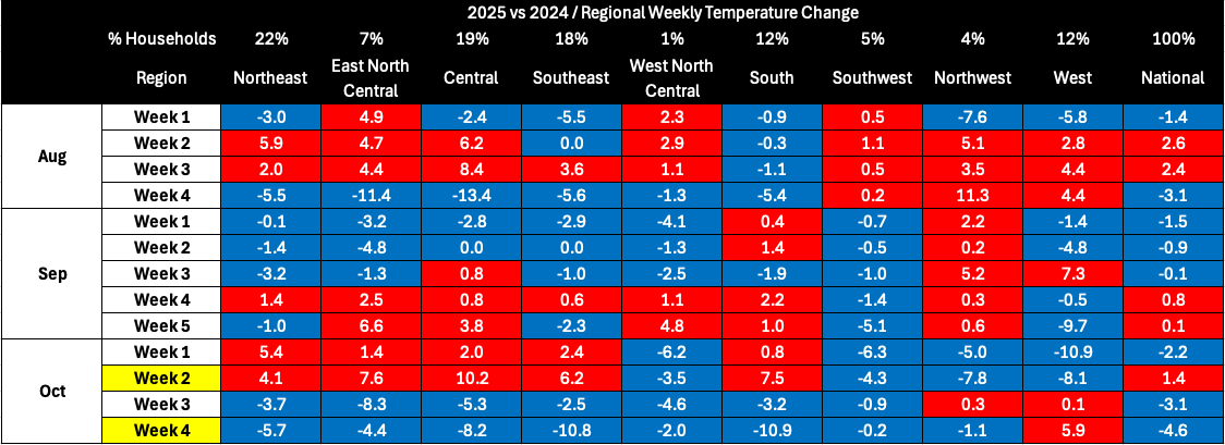Now that the data is finally restored, we can see the full retail Q3 pattern (August-October), and it essentially confirms my thesis: cooler-than-last-year conditions created a stronger setup for seasonal retail demand.