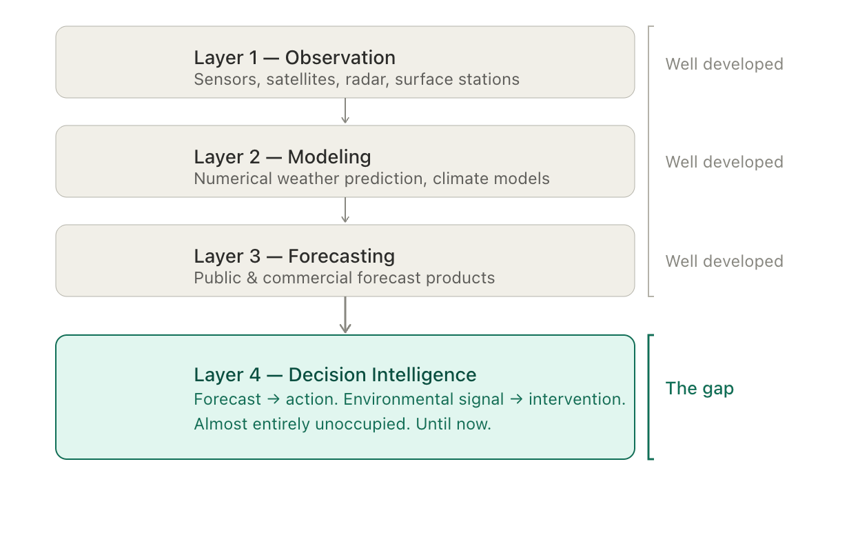 The weather industry has built extraordinary capability at Layers 1 through 3: observation, modeling, and forecasting.