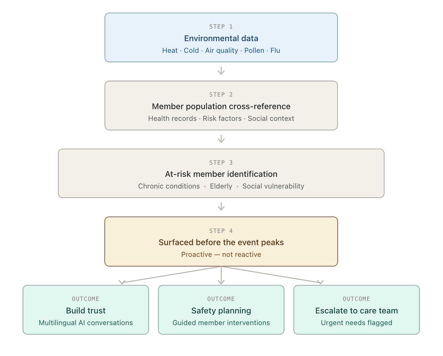 The workflow looks like this. Environmental data comes in. The platform cross-references it against the health plan’s member population — identifying who has chronic conditions, who is elderly, who faces social challenges that limit their ability to respond to heat. It surfaces the at-risk members before the event peaks. Then it reaches them — through multilingual AI conversational agents that don’t just push information, but build trust, guide members through safety planning, and escalate urgent needs directly to care teams.
