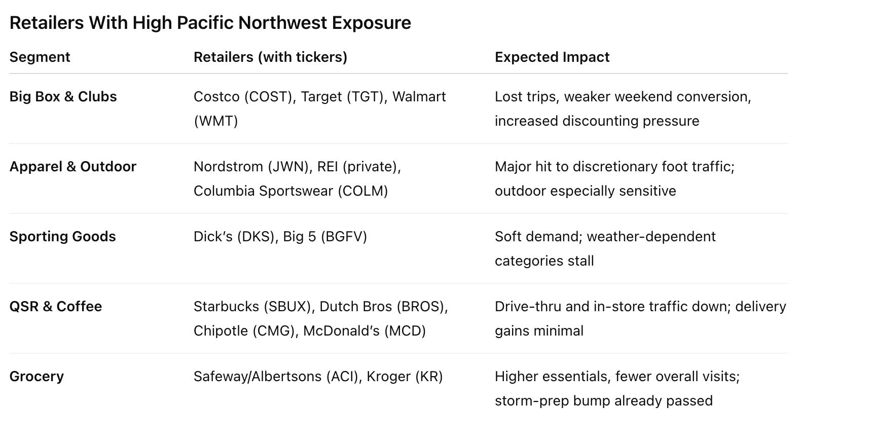 Atmospheric rivers don’t just cause damage — they cause economic displacement. When a storm parks over a region for days, shoppers shift from discretionary purchases to essentials.