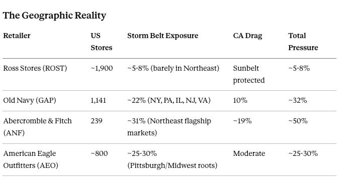 ANF has the highest Northeast concentration in the peer group and beat. AEO has deep Northeast roots and beat. GAP, with lower storm exposure than either, missed. Mall format isn’t the answer either — AEO and ANF are both mall-based and both beat.