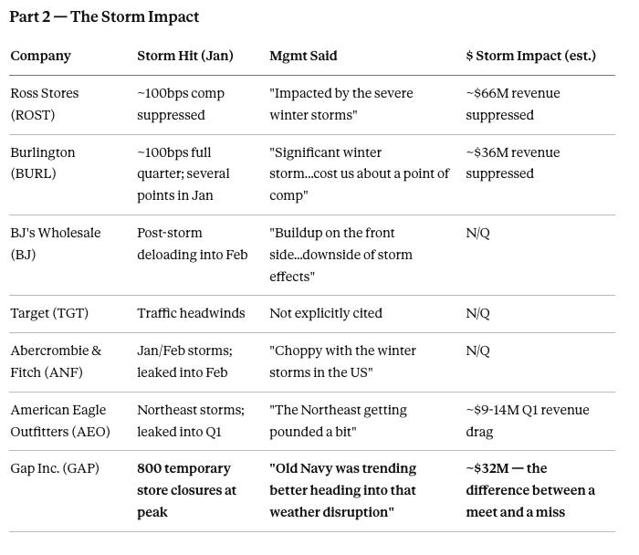 Then, in January, significant winter storms closed hundreds of stores across the same markets that had been outperforming. The storms suppressed traffic, cost companies roughly 100 basis points of comp, and gave management teams something concrete to mention on earnings calls.