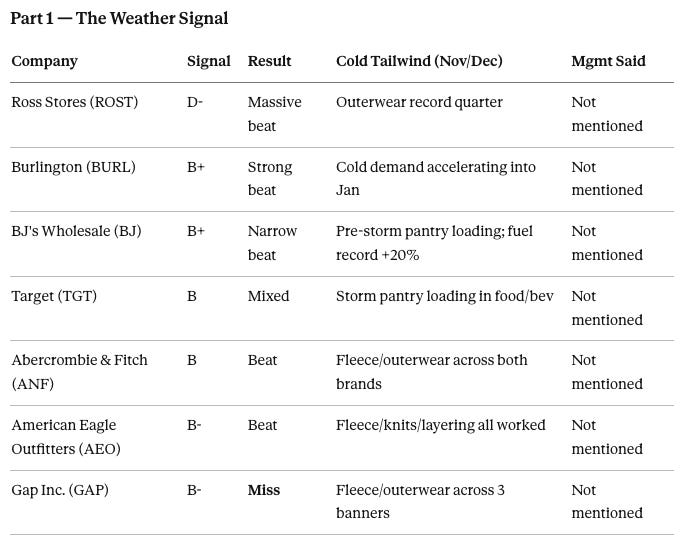 Across seven retailers this week, the pattern was identical: When the cold weather helped, management said nothing. When the storms hurt, management said so immediately.