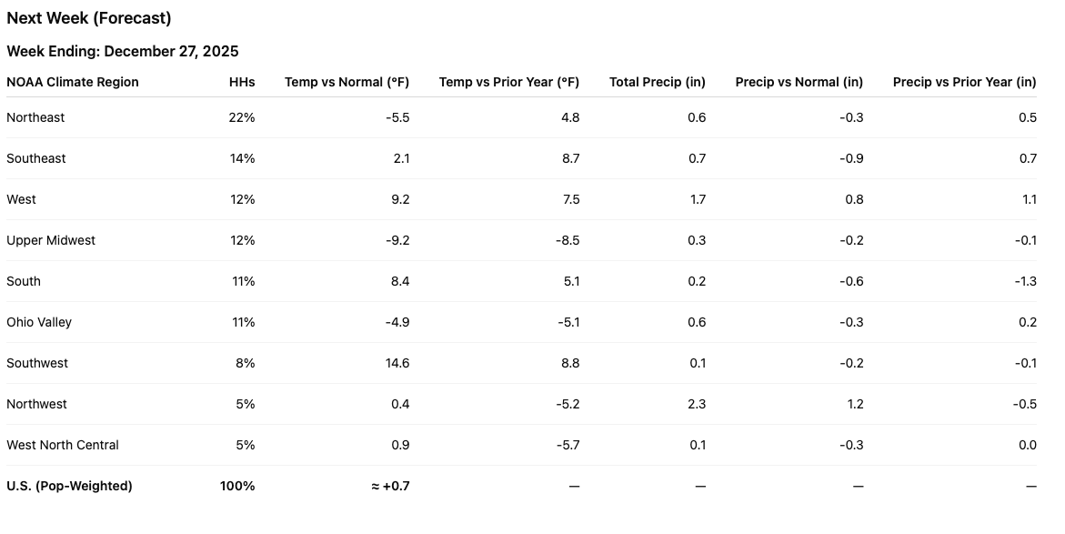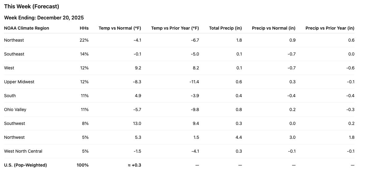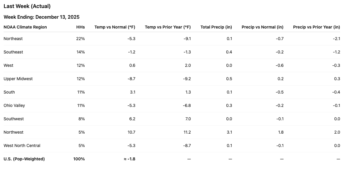 Last week delivered meaningful, population-weighted cold across the Northeast, Upper Midwest, and Ohio Valley, pulling households into winter routines and supporting winter categories where winter actually arrived.