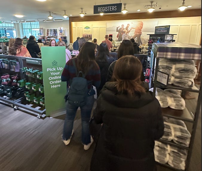 By mid-morning, the line at L.L. Bean was already snaking deep into the store, packed wall-to-wall. Later, at Macy’s, the crowd thinned noticeably. The promotions didn’t. “60% Off” signs dominated the seasonal floor.