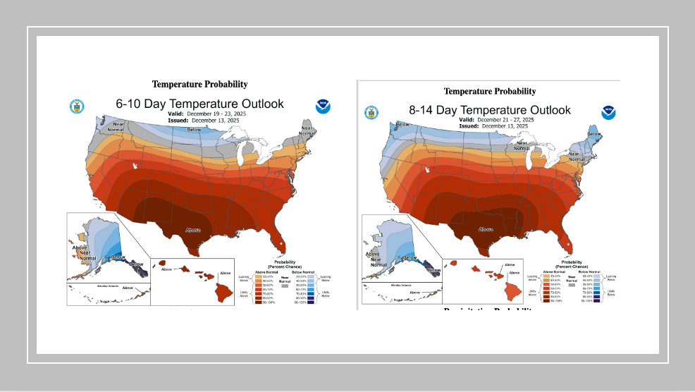Across the 6–10 day, 8–14 day, and Weeks 3–4 outlooks, the key feature is persistence, not volatility. The probability maps continue to hold a warm tilt across the South/Southwest and much of the West, while colder risk remains more concentrated in the Northern tier.