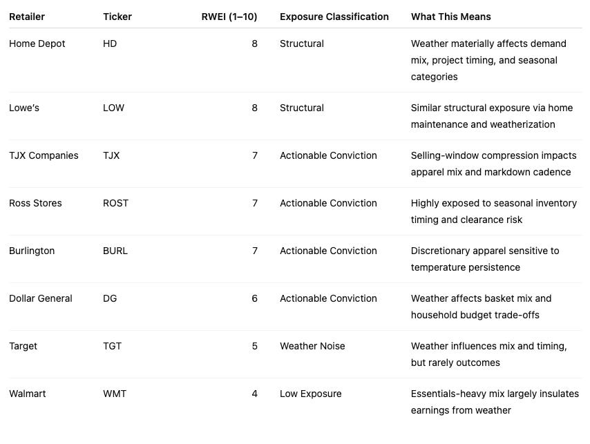 Retailers below the threshold (e.g., TGT as moderate, WMT as low–moderate) remain important for context, but should be treated primarily as mix stories, not weather-driven earnings stories.