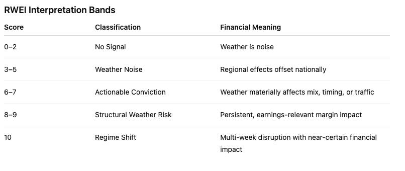 RWEI ≥ 6 → Weather is earnings-relevant under persistent regimes